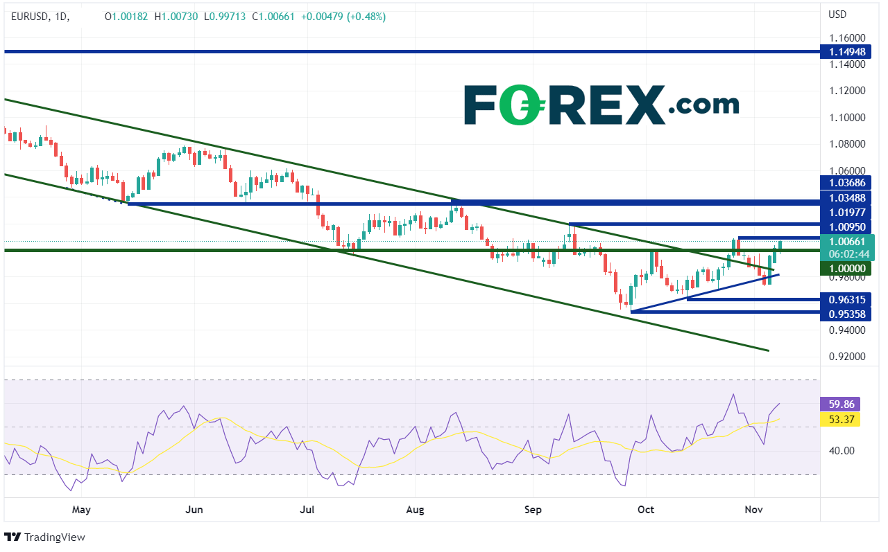 如果通胀数据低于预期,预计美元将会走低。因此,欧元兑美元可能会走高。 自2022年2月达到峰值1.1495以来,该货币对一直处于下行通道。9月28日,该货币对触及低点0.9536,随后反弹至1.0000。自此,欧元兑美元一直在0.9705至1.0094之间盘整,同时突破了下行通道的上沿。