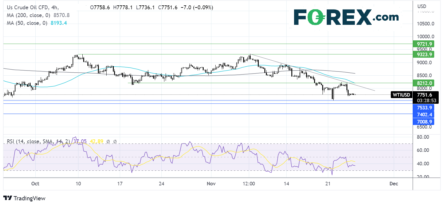 当前油价低于11月初形成的下行趋势线。RSI处于看跌区域,4小时图上的50日均线形成死叉信号。