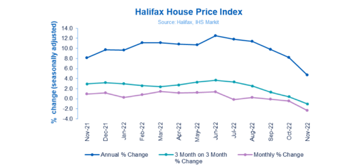 随着英国服务业和制造业PMI指数仍停留在荣枯线(50.0)下方区域,工业将进一步拖累经济活动。11月建筑业PMI指数也濒临崩溃,只是勉强维持在荣枯线附近。11月建筑业PMI为50.4,低于预期的53.0,较10月的53.2大幅下降。今日坏消息接踵而至,这次主要来自于房市。Halifax房价指数11月环比下跌2.3%,年增速从8.2%降至4.7%。