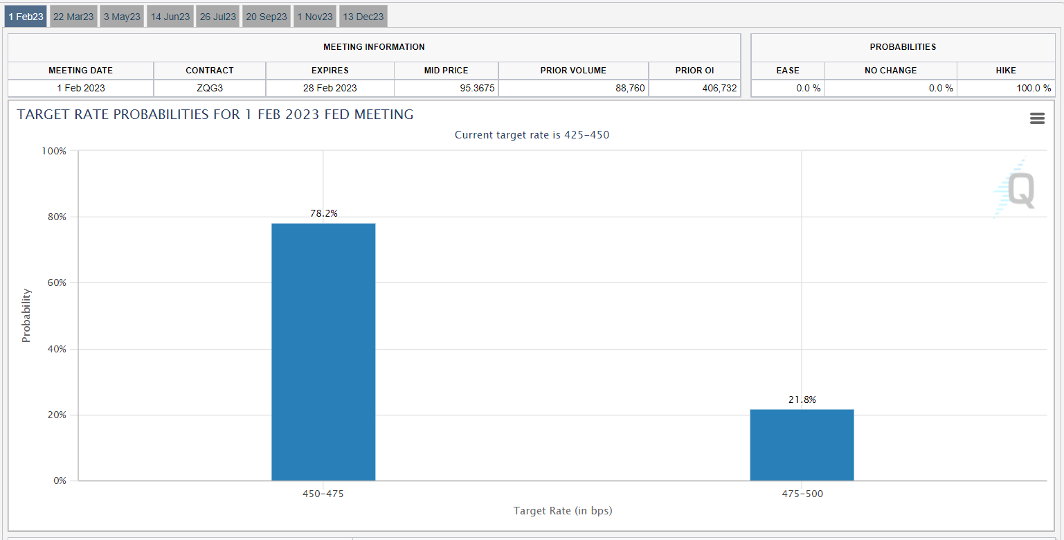市场可能面临CPI数据弱于预期的风险。美联储已经在其《经济预期摘要》中指出,预计最终联邦基金利率将达到5.1%,而目前的联邦基金利率是4.50%。如果通胀数据弱于预期,市场可能认为2月1日会议上加息几率较低,并据此做出反应。根据芝商所FedWatch工具数据,市场预期加息25个基点的可能性为78%,加息50个基点的可能性为22%。