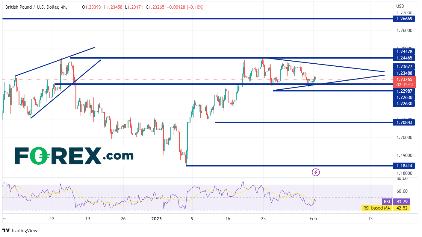 在4小时图内,英镑/美元恰好徘徊在1.2300附近的水平支撑上方。 如果美联储发出就业市场强、工资水平高、整体通膨的信号,英镑/美元应出现下行趋势。 第二档支撑位落在1月24日低点1.2263。 由此向下,货币对价格可能下行至50天移动均线1.2185(见日线图),随后下探1月12日低点1.2084。 倘若美联储发出加息措施成功发挥效果的信号,甚至可能在3月暂停加息,英镑/美元或会进一步走高。第一个阻力位可能在1月23日1.2410附近的下行趋势线出现,由此向上会在1月23日的高点1.2447遭遇阻力。继续向上,货币对价格可能触及2022年5月27日高点1.2667。
