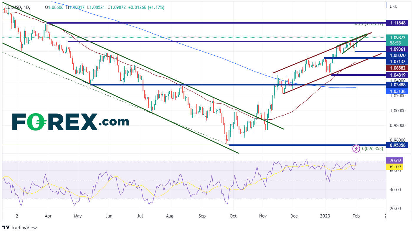 由于会议不够鹰派的言论和会前的市场定价,美元随即遭到抛售。美元指数(DXY)大幅走低,回到近期通道的顶部趋势线下方,低于2022年5月30日的水平支撑位101.29。DXY的下一个支撑位在心理整数支撑位100.00。低于该点位,价格可能会跌至2022年3月的支撑位99.42附近。要想扭转跌势,它得回到昨日高点102.60上方。下一阻力位于1月12日的高点103.29。