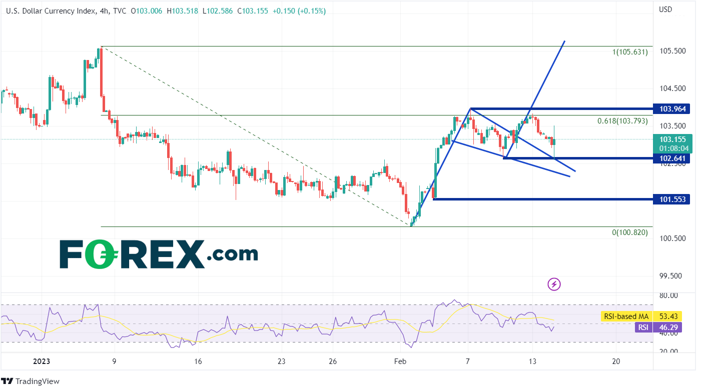 在240分钟图上,DXY自2月2日创下近期低点100.82以来一直在走高。该指数先是回调至1月6日高点到2月2日低点区间的61.8%斐波那契回撤位103.79附近。然后它回到三角旗形内,并在2月10日上破图形。然而,在CPI数据公布后,价格回落,重新测试三角旗的顶部趋势线和2月9日以来的低点102.64附近。如果价格能够突破近期高点103.96,那么下一个阻力位要到1月6日高点105.63,这也在三角旗形目标位附近。但是,如果价格跌破今天的区间,接下来的支撑位是三角旗形的底部趋势线102.25附近。在此之下,水平支撑位落在101.55,然后是2月2日低点100.82。