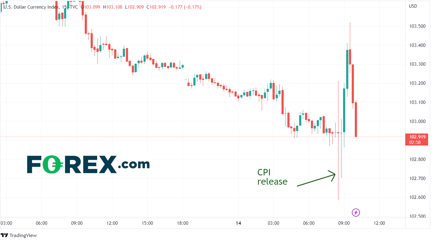 数据公布后,美元指数波动极大,15分钟内交投于102.59至103.21之间。此后,波动仍在延续,DXY交易价格一度高达103.52,随后回落至日常范围内。