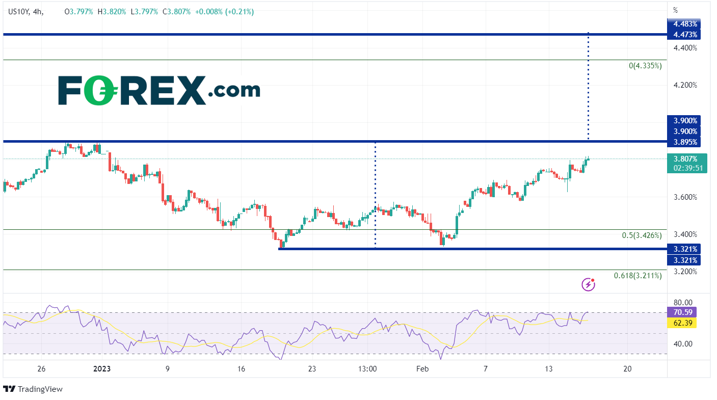 美国10年期国债收益率自8月2日以来一直在上升楔形中走高,直到突破顶部趋势线并在10月21日创下4.335%的高点。通常情况下,当价格(或在这里应称为收益率)未能在形态的一侧保持突破态势时,它通常会移向另一侧进行测试。这一关键的美债收益率最终在2022年11月10日跌破该形态的底部趋势线并大幅走低(稍作回顾,美国在2022年11月10日发布了非常疲软的CPI数据)。此后,美国10年期国债收益率交投于3.321%至3.90%之间。从2022年8月2日低点到2022年10月21日高点区间的50%回撤位为3.426%,但它已经多次充当该基准收益率的支撑位。