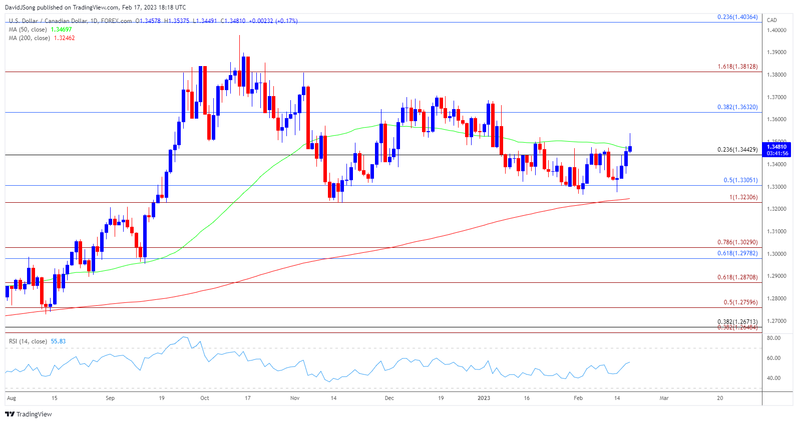美国非农就业人数(NFP)上涨51.7万以及消费者物价指数(CPI)的居高不下似乎助长了对更严格政策的预期,因为CME FedWatch Tool现在反映最终的联邦基金利率在5.25%至5.50%的概率大于80%,美元可能在本月剩余时间内跑赢加拿大货币,因为加拿大央行(BoC)“预计将保持政策利率处于当前水平,同时评估累进加息的影响。”