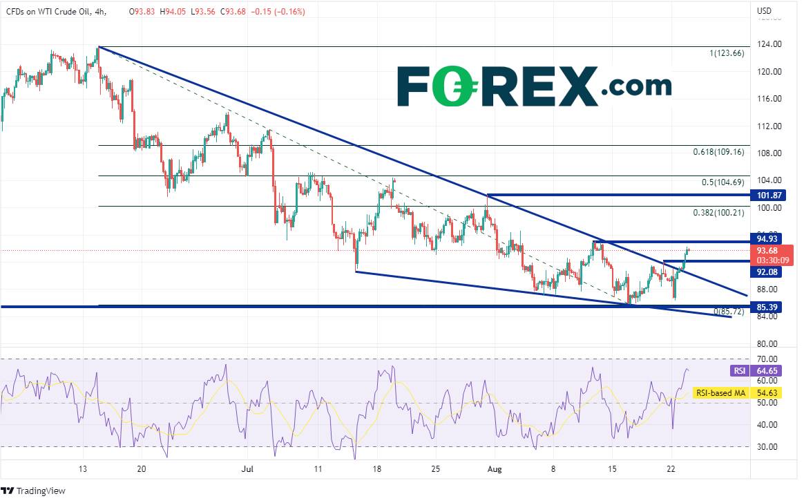 中国在周一早上下调1年期和5年期贷款报价利率,并且宣布计划向陷入困境的开发商提供290亿美元的专项贷款。这些举措都是为了激励经济增长。除了通胀加剧引发全球经济衰退的关切之外,现在又多了中国房地产市场崩盘的广泛担忧。另外市场盛传,伊朗-美国协议终于有望敲定,从而增加市场供应。该消息导致油价下跌,西得州原油在周一早上下挫4美元,至86.26低点,一度考验8月16日低点85.72。但就在数小时后,OPEC+新任负责人表示,OPEC目前正面临剩余产能不足的普遍困扰。油价因此调头向上,西得州原油收复所有失地,收高57美分,报在90.44附近。今天,油价继续上涨。有OPEC官员表示,如果全球经济衰退,则支持减产。西得州原油价格目前报在94.00附近。