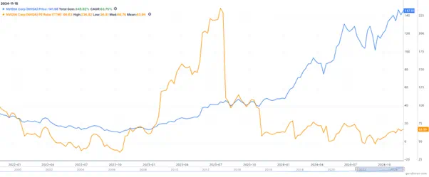 英伟达股价(蓝)和市盈率(黄)(2022-2024  来源:Gurufocus