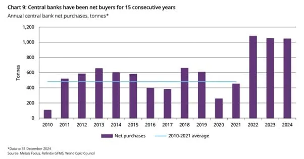 世界黄金协会数据显示,2024年全球黄金需求到达4974吨创历史新高,其中全球央行购金量连续三年突破1000吨且四季度同比增长54%,贡献了2024年黄金需求增量的70%以上。