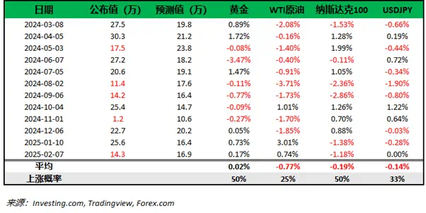 下图为过去12次非农数据以及当日市场表现,仅供参考。