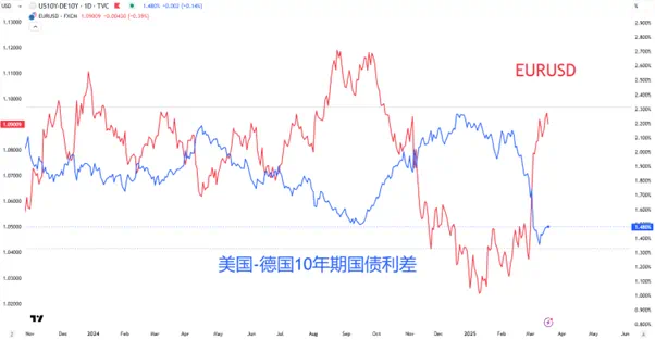 一方面,弱势美元变相提升了欧元的吸引力。不过更重要的是,包括德国在内的欧洲国家纷纷表态将转向财政扩张来刺激经济和强化国防,市场对此给予了积极的反馈。积极的财政政策或降低欧洲央行大幅降息的必要性,也会增加举债规模从而提升欧洲各国的国债收益率。以美国和德国为例,两国的国债利差已经从2.2%降至1.4%,这是导致欧元雄起的主要原因。