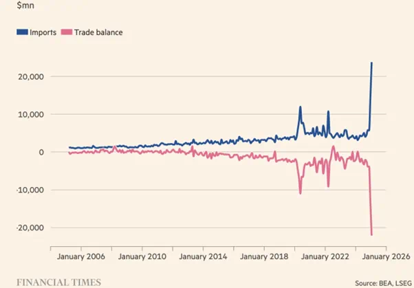 而同期伦敦金的库存则连续三个月下降。不仅是伦敦,全世界的黄金都在加速运往美国。数据显示,美国1月进口了价值300亿美元的黄金,是疫情时期的两倍左右。