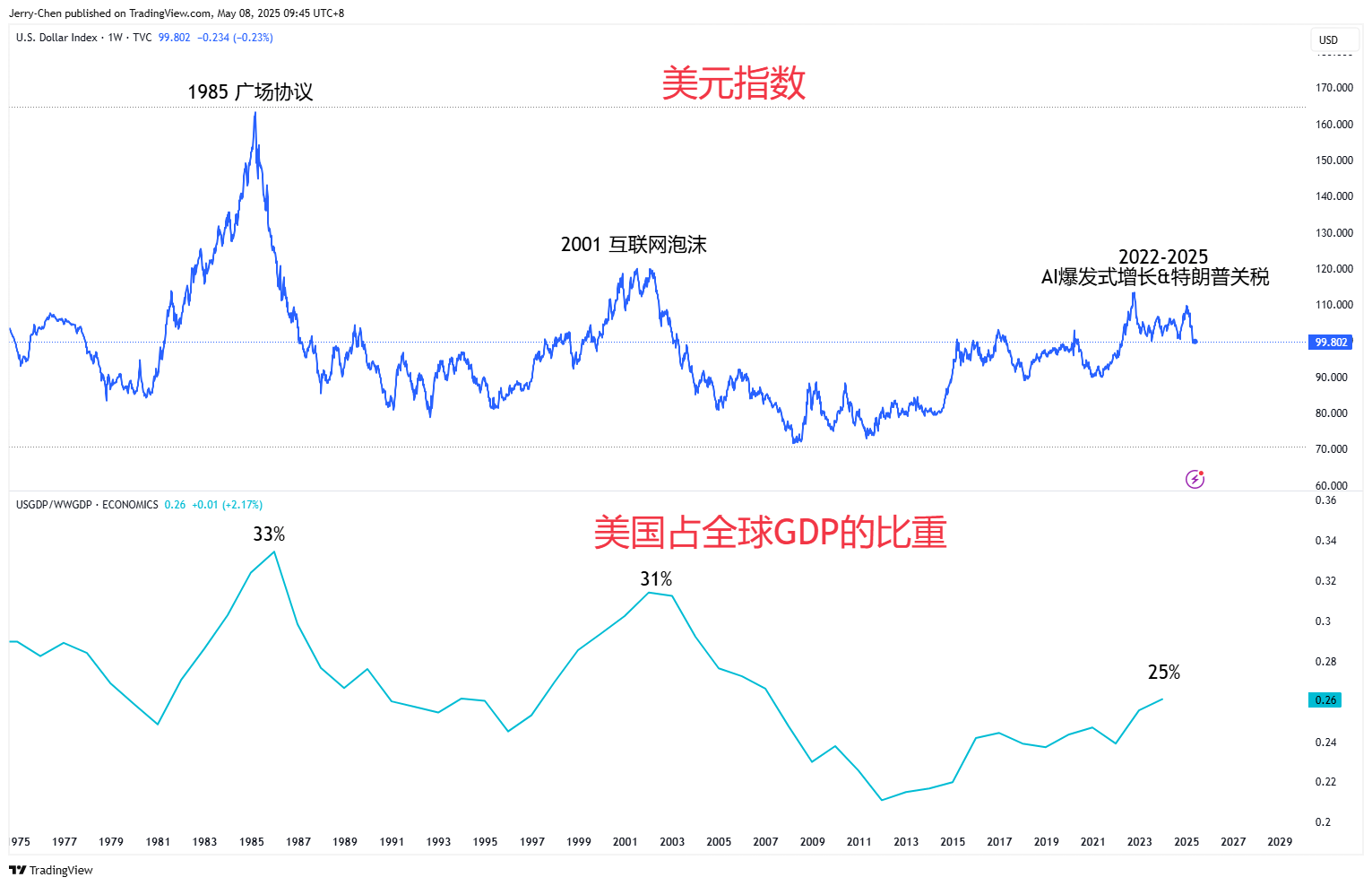 回顾历史,目前的美元指数处于仅次于1985年和2001年的历史高位,而和当时相比,现在的美国不论是GDP的全球占比,还是贸易或制造业的份额都无法和当年相提并论。储备货币的多元化或许会得到越来越多的探讨。