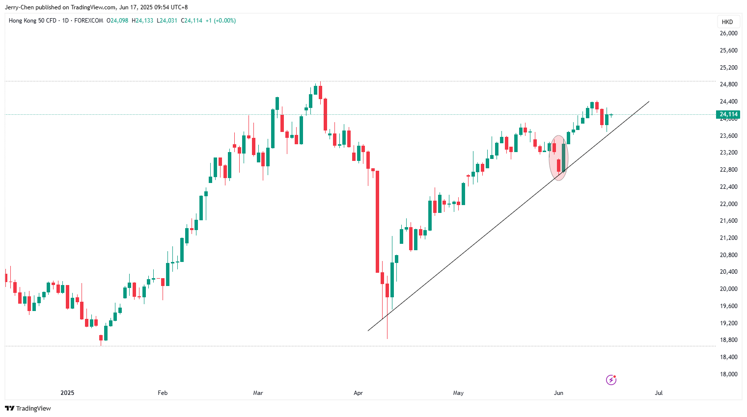 恒生指数(HK50)周一重回24000点上方,延续着4月以来的上升趋势,也和全球主要股市近期的表现保持同步。但值得注意的是,周一收盘的形态并没有6月初的看涨形态那样强劲,这或许暗示在接近前高附近多头会受到越来越多的压力(包括地缘风险因素),上涨势头可能放缓。