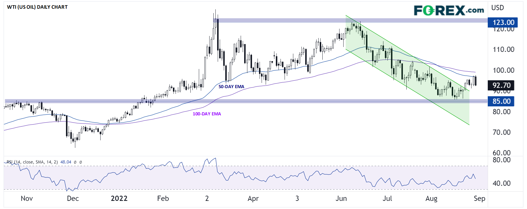观察西得州原油过去一年的日图我们发现,油价在两周前于2021年10月/11月高点85.00区域企稳后反弹并突破长达10周的下降通道,现在于97.00-98.00区域遇阻,那是50和100天指数移动均线相汇处。