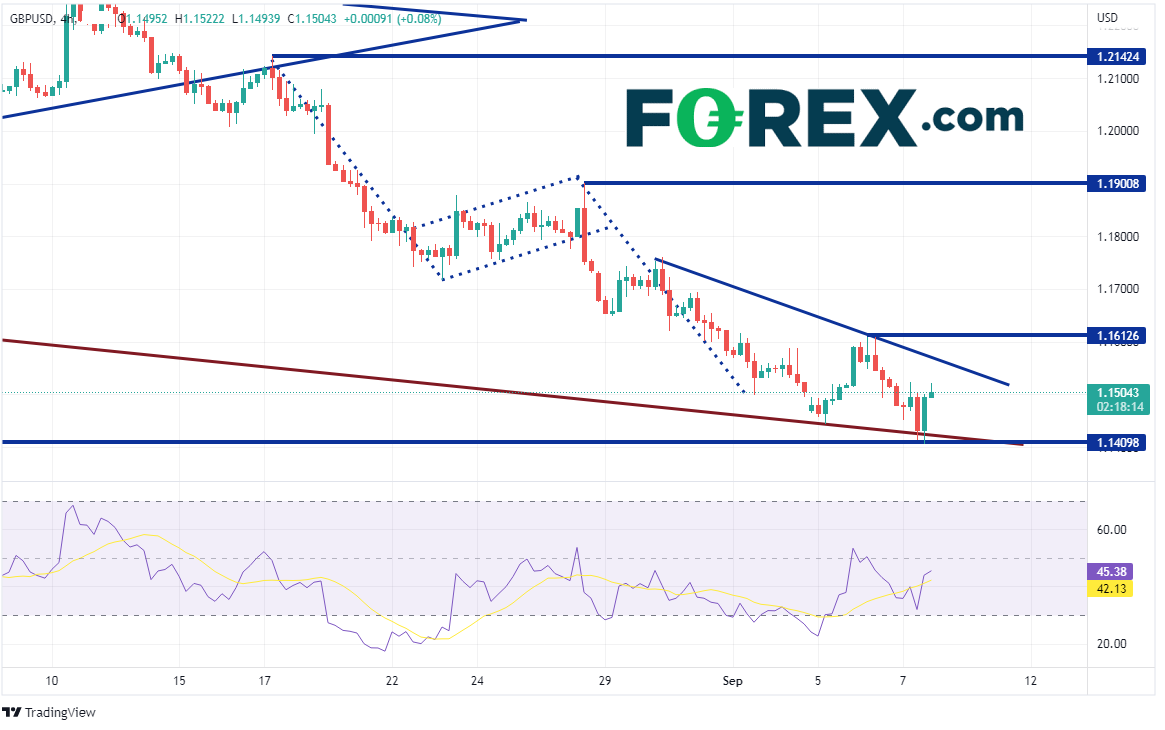 英镑/美元今天跌至1985年以来最低点1.1405,后市是否继续下跌?有迹象显示价格准备回升,比如RSI在超卖区域背离、出现锤子K线以及低点支撑带。另外,在英国央行下周潜在加息之前,也可能涌现一定的获利回吐盘。