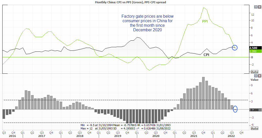 中国8月工业品出厂价格指数(即生产者物价指数,PPI)年率仅上涨2.3%,为2021年2月以来最低通胀率,也是2020年12月以来首个月度PPI低于居民消费品价格指数(CPI)。但是,CPI年率也自2.7%小幅下降至2.5%。PPI是CPI的一个关键输入来源,其年率的下降表明CPI上行压力减弱,同时也表明中国成长前景减弱。分析师已下修中国2022年经济增长率。