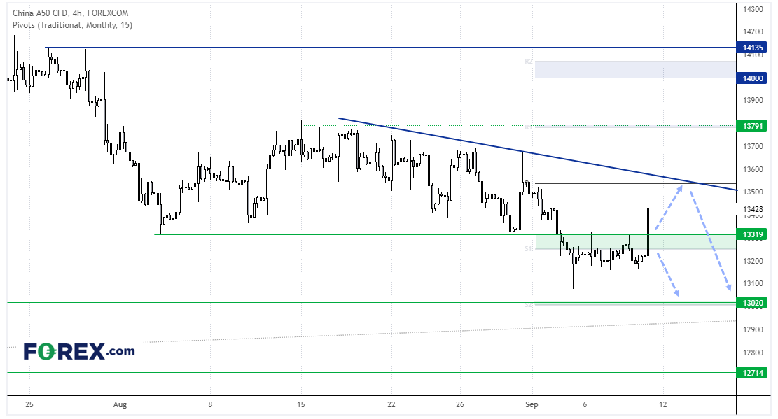 中国A50指数今天借上冲之势站上13,320阻力,但8月终了以来股指在13,320 – 13,800区间反复震荡。盘中交易员的短线策略可能是在13,320上方逢低买入,目标趋势线阻力或月图中枢点位13,350附近。但在形成清晰的趋势之前,最佳策略仍可能是区间交投。即,在上攻阻力时逢高沽出,在下探支撑位附近时逢低买入。
