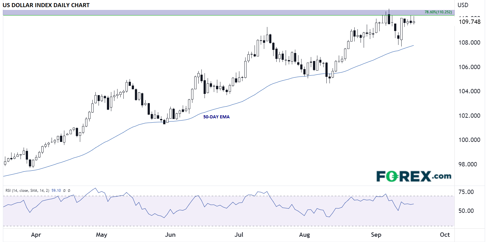 外汇市场明显继续做多美元(并不是说一定成功)。美元指数继续守住上翘的50天指数移动均线,天平仍在多头这边。此文发稿时,美元指数正在测试2001年-2008年大跌行情的78.6%回档位,即110.25附近。但如果美联储届时的立场比预期强硬,可能推动美元指数突破并收上前述区域,10月前剑指112.00或更高的价位。