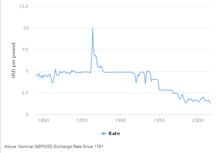 英镑/美元在整个19世纪都交投于5:1左右,但过去半个世纪整体不断下跌。英镑和美元两者的价值最接近的时候是在1985年,当时英镑/美元一度跌破1.10。请看下图。